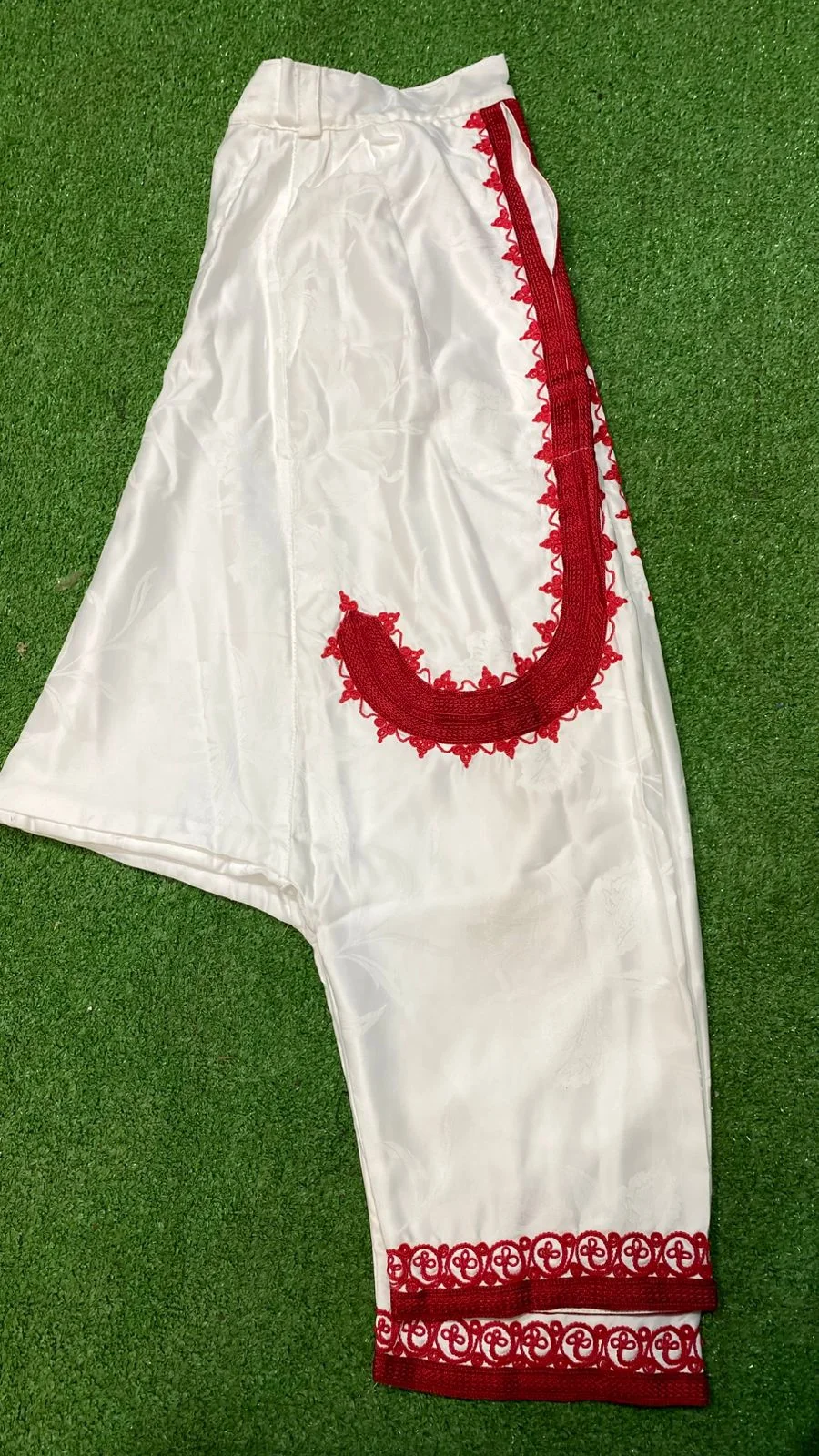 تطريز يدوي متقن: يزدان السروال بتطريزات ذهبية أنيقة على شكل زخارف مغربية تقليدية على الجانبين وأسفل الساقين، مما يضيف لمسة من الفخامة والرقي.